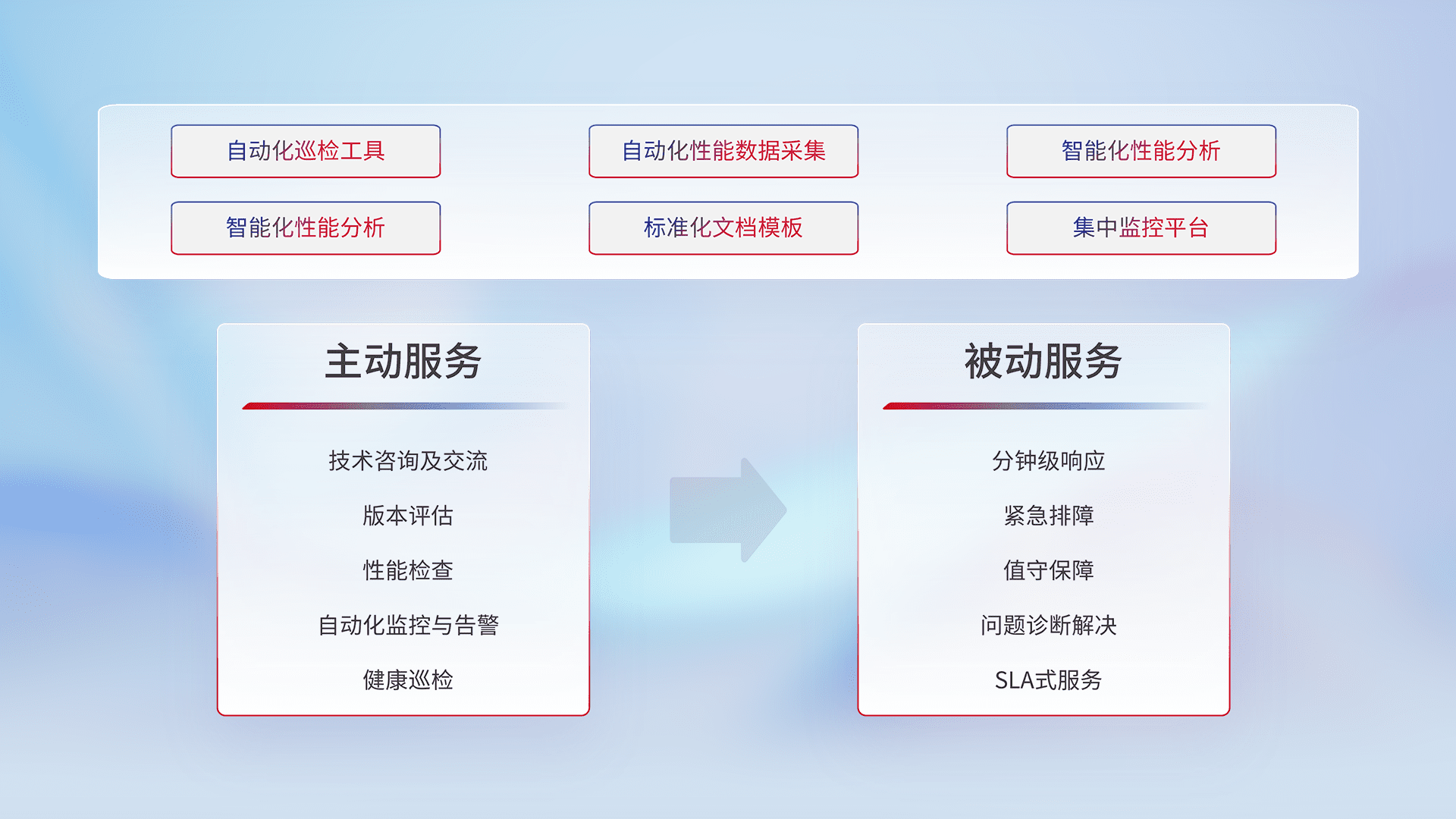 智能化工具和标准化文档,,,,保障服务质量,,,,提供主动服务(包含技术咨询、、、、版本评估、、、性能检查、、自动化监控与告警、、健康巡检)和被动服务包含(分钟级响应、、、紧急排障、、、、值守保障、、问题诊断解决、、SLA服务)。。