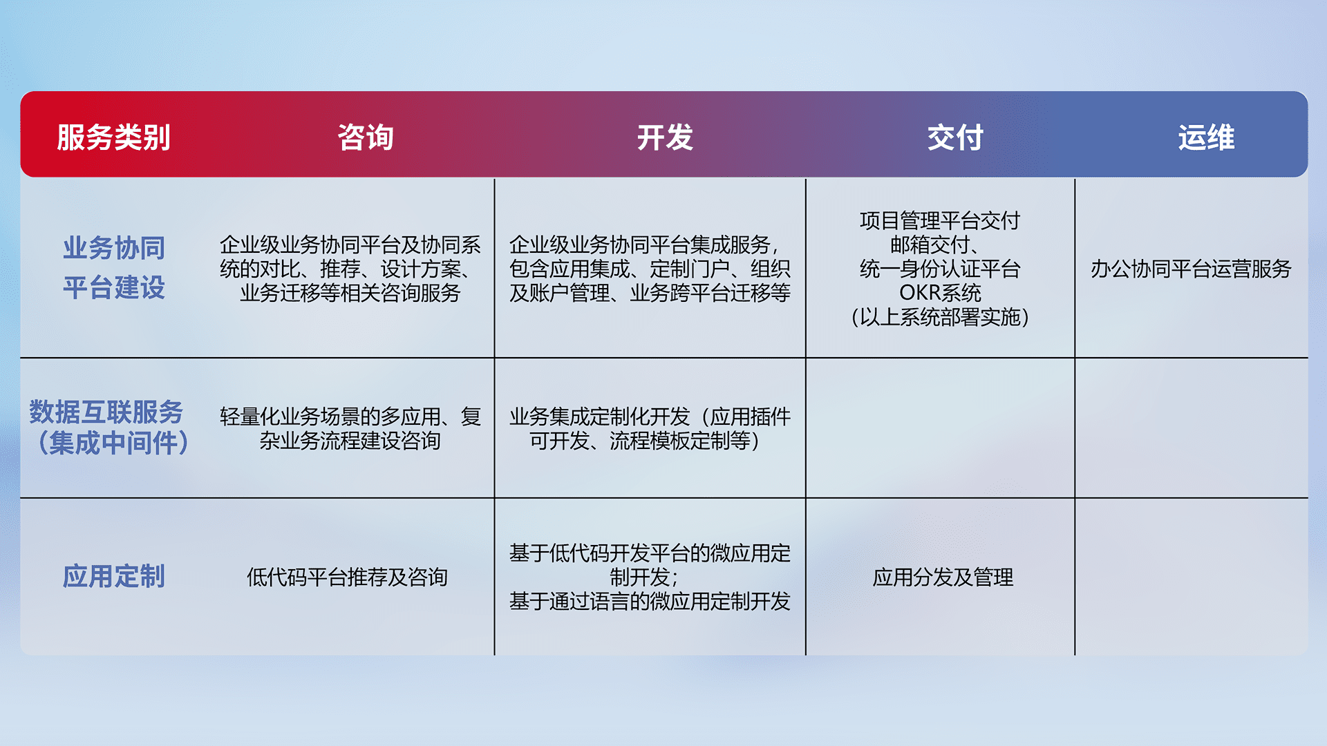 针对钉钉、、企微、、、IDaas等平台级产品提供产品的规划、、、方案、、、、交付、、、定制化开发等服务,,,实现如统一协同办公、、、智能客户服务、、、、混合会议管理、、、、智能数据查询、、等业务场景,,实现数字化转型。。。